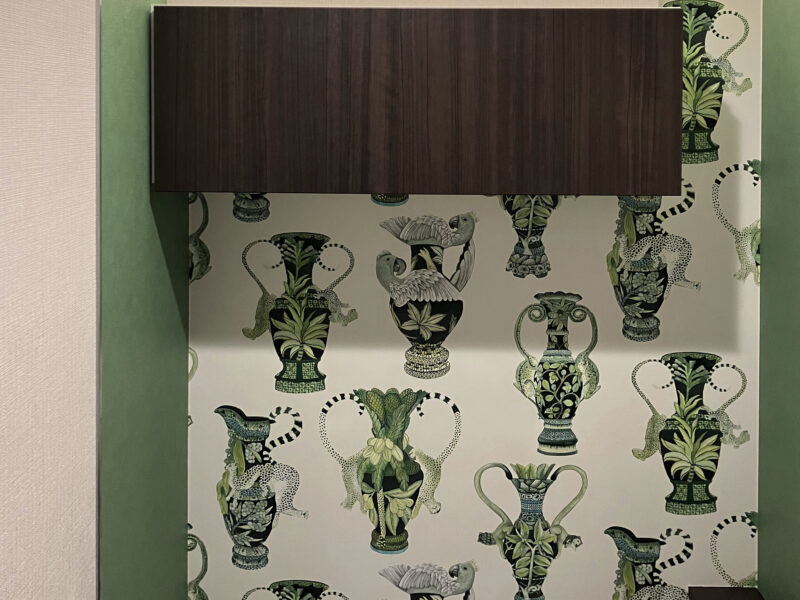 両サイドをグリーンで引き締めて壁紙を寄り素敵に見えるようにしています。