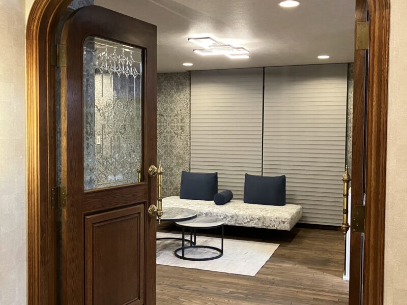 全体的にデコラティブなドア周りやデザインガラスとタイルという重厚感のある建材同士のバランスを考慮したコーディネートになっております。