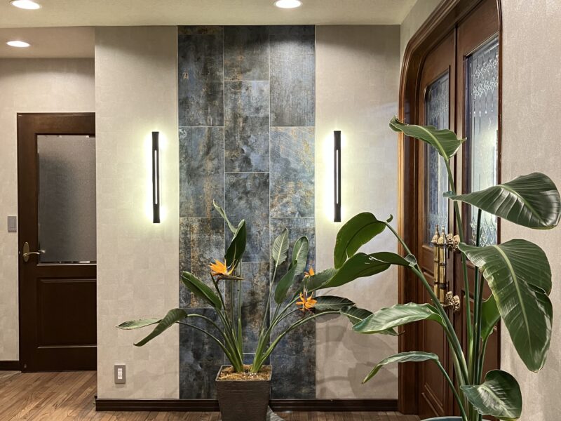 玄関にはアートとして大判でモダンなシルバーブルーのタイルを飾りました。